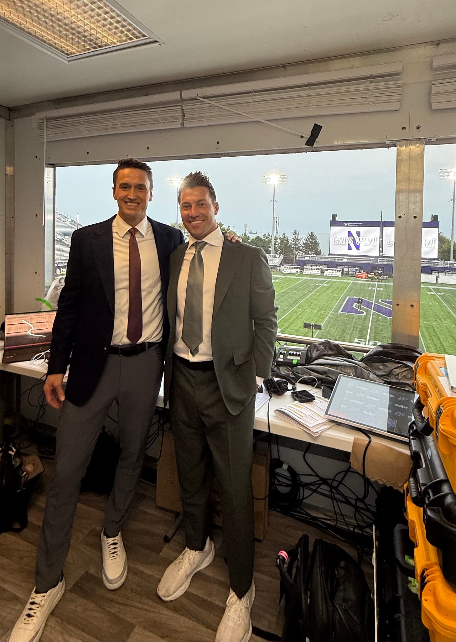 This weekend marked our first time paired in the booth–Rhett on play-by-play, me in my usual seat as analyst. Midweek, I watched him prep for our game while balancing his NFL duties. Rhett hosts Thursday night coverage around the Amazon Prime NFL game on NFL Network and post show races to catch a red-eye, lands on no sleep, squeezes in a workout, races to meetings and never once complains. Just pure professionalism.